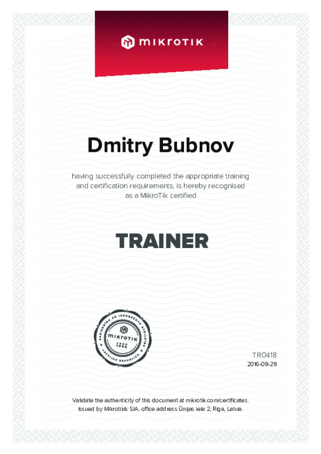 В 2016 получил статус Mikrotik Certified Trainer (TR0418) и начал вести официальные курсы Mikrotik в Челябинске. На момент написания этого текста (27 октября 2017) мы выдали 49 сертификатов об успешной сдаче экзаменов Mikrotik.